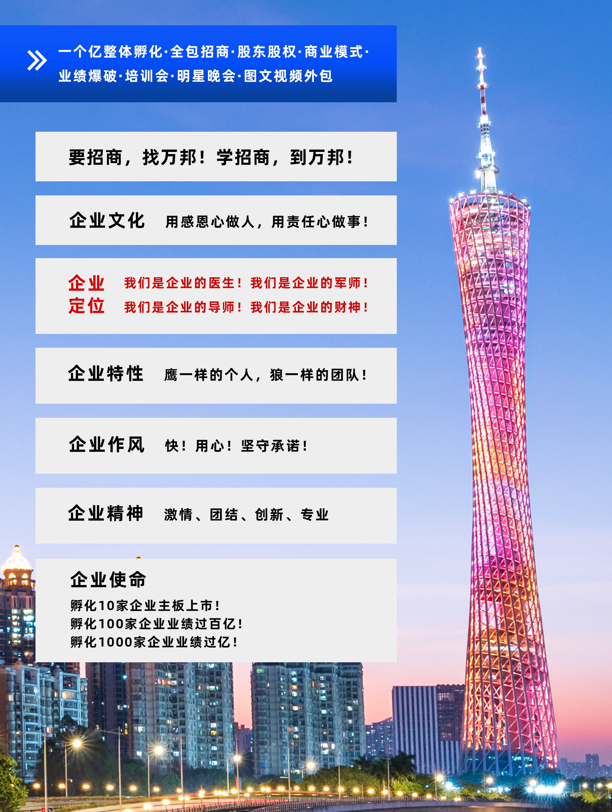 萬邦集團成立于2003年6月,專注于為企業(yè)進行招商和整體孵化,包含公司診斷、產品定位到量身打造商業(yè)模式系統(tǒng),再到投人、投錢、投資源,一起干的分紅股東招募,鐵血軍團的打造,全國招商會議,為企業(yè)建立一套完善;成熟的招商系統(tǒng),教育系統(tǒng)、培訓系統(tǒng)。